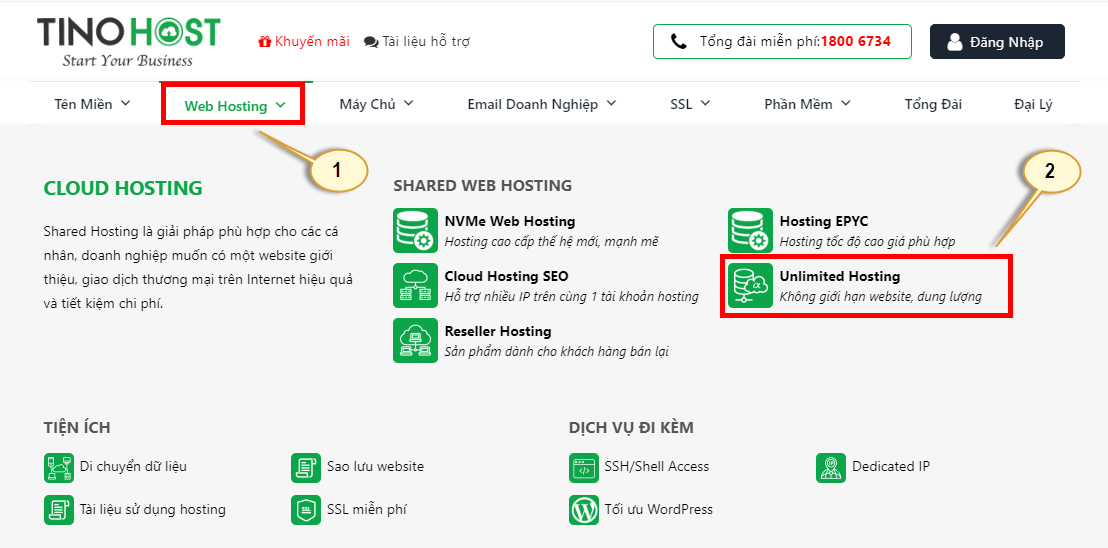 Sau khi truy cập vào giao diện chính của TINO, các bạn chọn vào Web Hosting —>chọn tiếp Unlimited Hosting