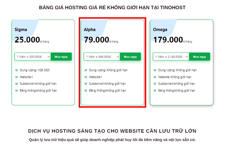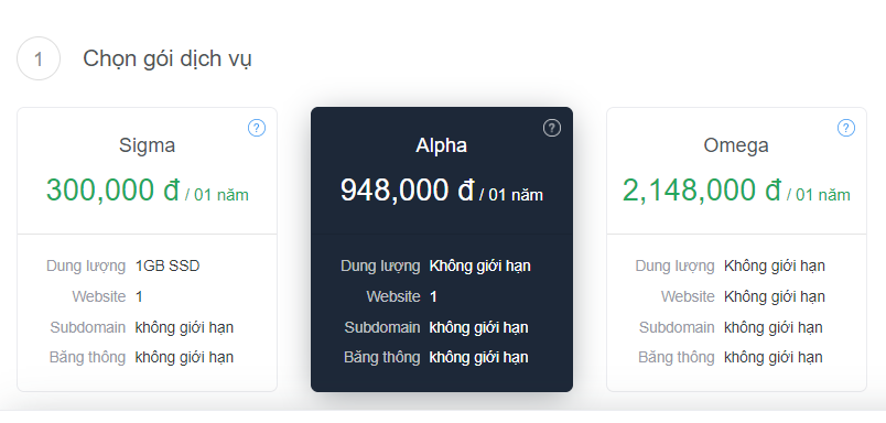 Nếu các bạn định hướng là website của mình sẽ cập nhật nhiều dung lượng trong tương lai thì các bạn nên chọn gói số 2 hoặc số 3 là Alpha và Omega. Ở đây mình sẽ chọn Alpha.