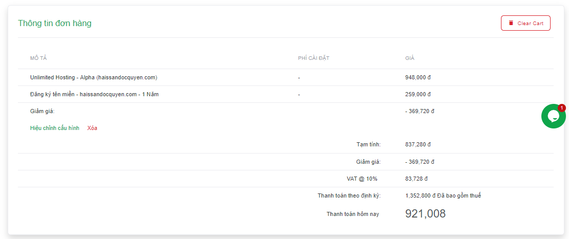 Các bạn sẽ xem lại các thông tin của gói hosting mình đã chọn, ở đây thông tin gói số 2 là UH – ALpha bao gồm: