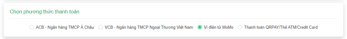 Chọn phương thức thanh toán: Có thể thanh toán online qua ví momo hoặc chuyển khoản qua ngân hàng.